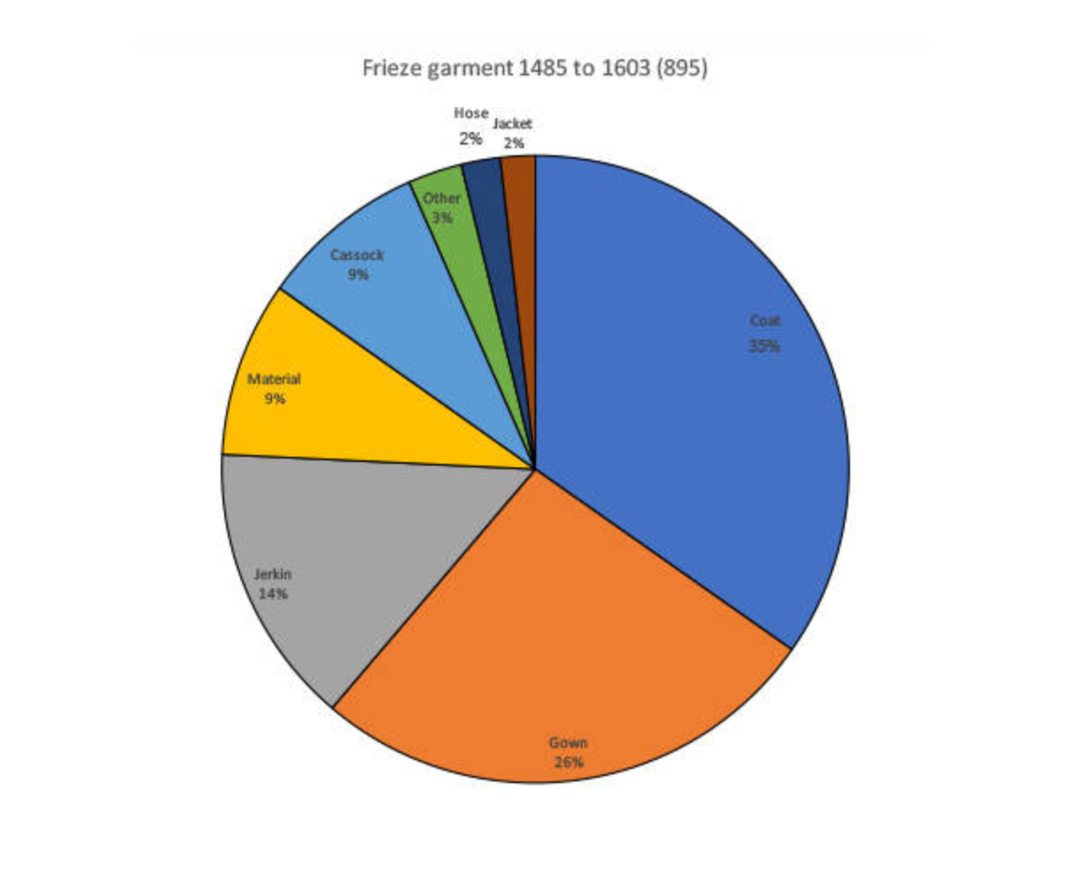 The pie chart in the photos illustrates that 895 items from a survey of over 57,000 garments described in wills, inventories and accounts written between 1485 and 1603 were specifically described as being made of frieze. This chart gives a good indication of the kinds of garments that were commonly made of frieze for lower-class and middle-class Tudors.