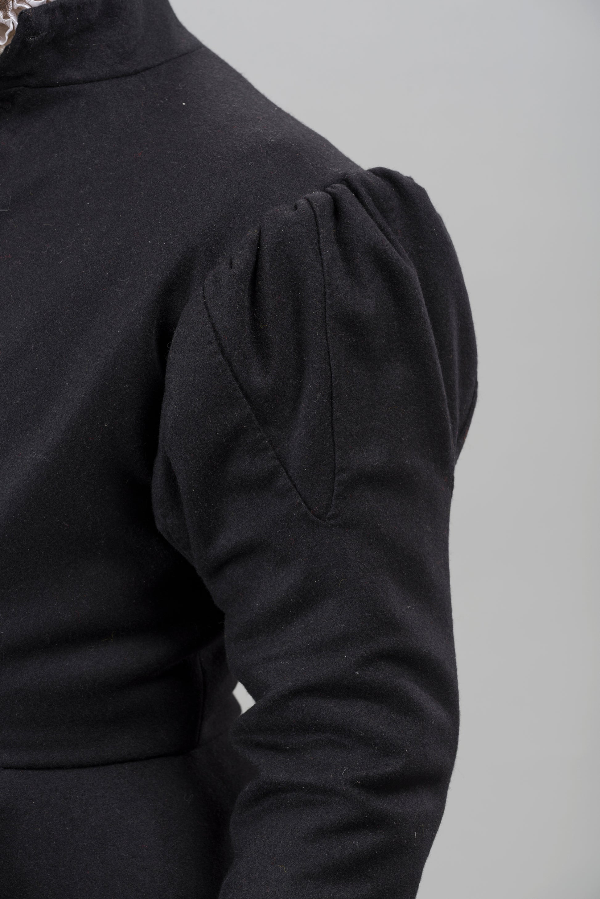 Made of beautifully soft black worsted lined in the body with red frizado and in the skirt with black linen. The sleeve shaping is achieved with the insertion of hand-stitched gussets at the sleeve head. All finishing is by hand and there is no visible machine stitching on the inside or outside. The jacket fastens at the front with hand made cloth buttons and hand-stitched buttonholes.