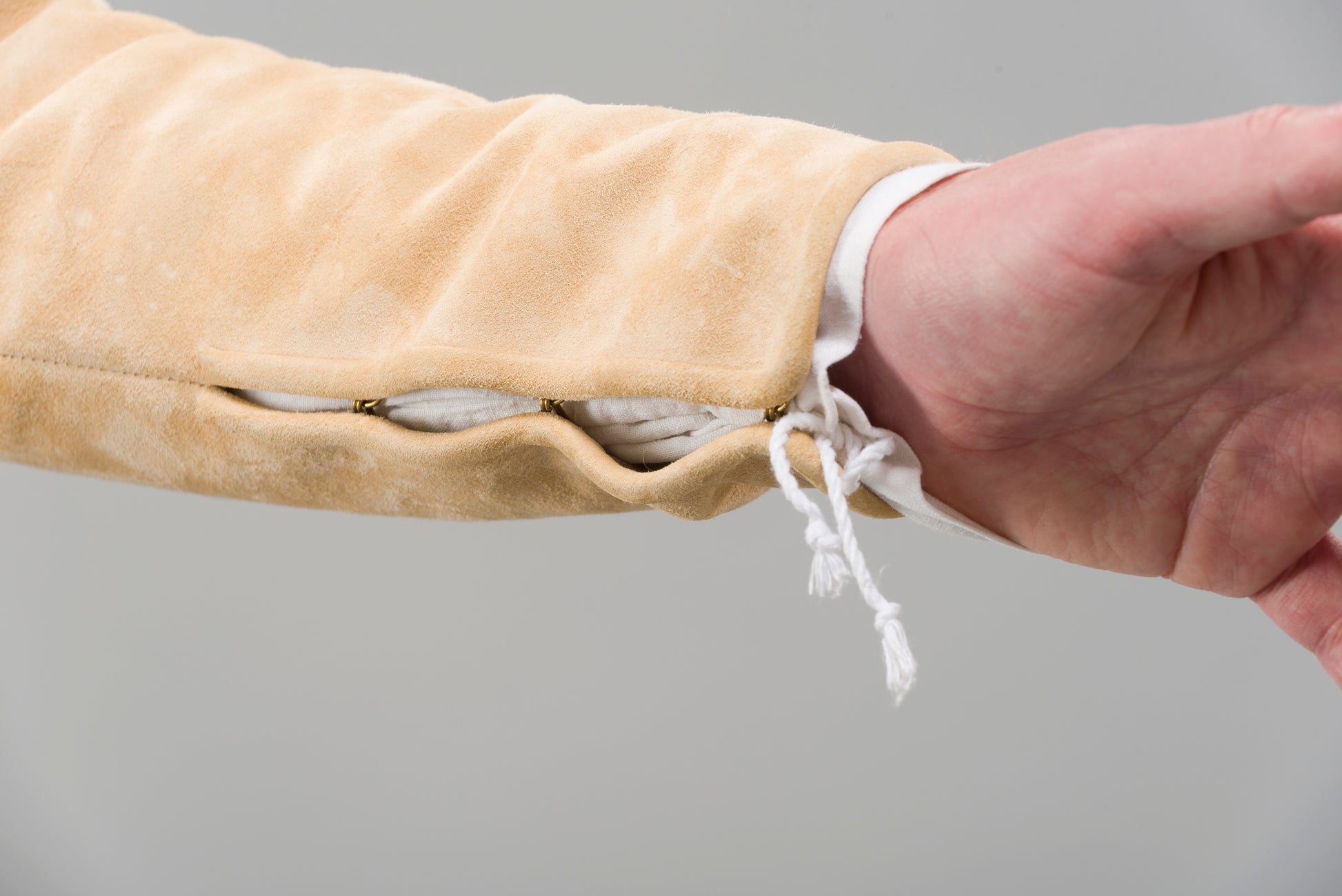 Made of goatskin leather dressed suede side out and lined with unbleached linen. The skirt features working pockets. The doublet fastens at the front with small 'Flower Dome' pewter buttons and hand-stitched buttonholes. The buttons are pushed through holes in the doublet and secured with a linen tape, meaning that they can be easily swopped for alternative styles. The sleeves fasten at the cuff with handmade brass hooks and eyes. A strip of canvas is worked with hand-stitched eyelets inside the waist for trussing hose. The collar features a decorative pinking detail at the back. All finishing is by hand and there is no visible machine stitching on the inside or outside.