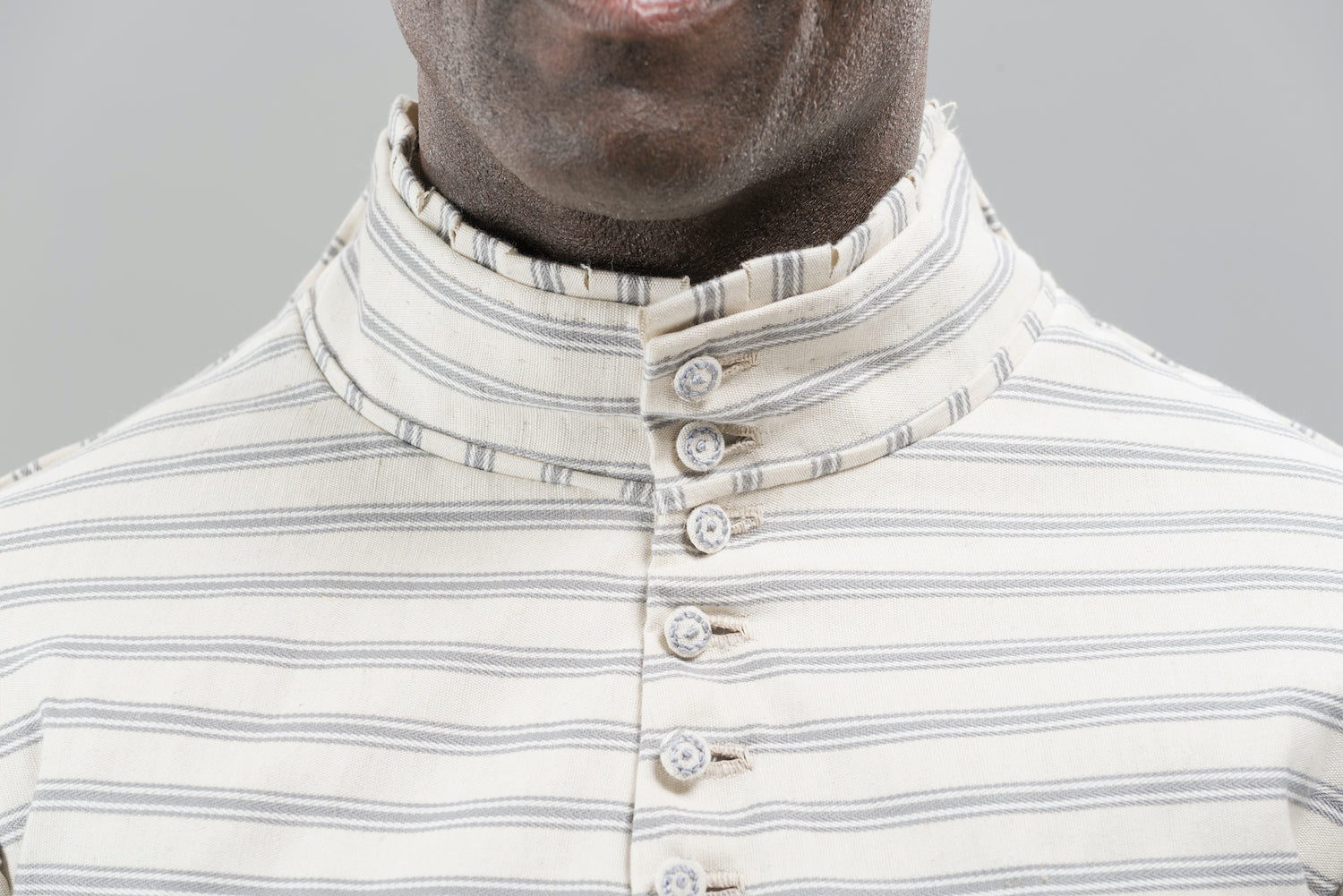 Made of cream/grey striped linen/cotton canvas lined througout with unbleached linen. The seams are finished with narrow welts (similar to modern piping) and the collar and wrists are edges with picadills. The jacket fastens at the front with hand embroidered and handmade cloth buttons and hand-stitched buttonholes. Eyelet holes are worked on the inside waist for trussing hose or breeches. All finishing is by hand and there is no visible machine stitching on the inside or outside.