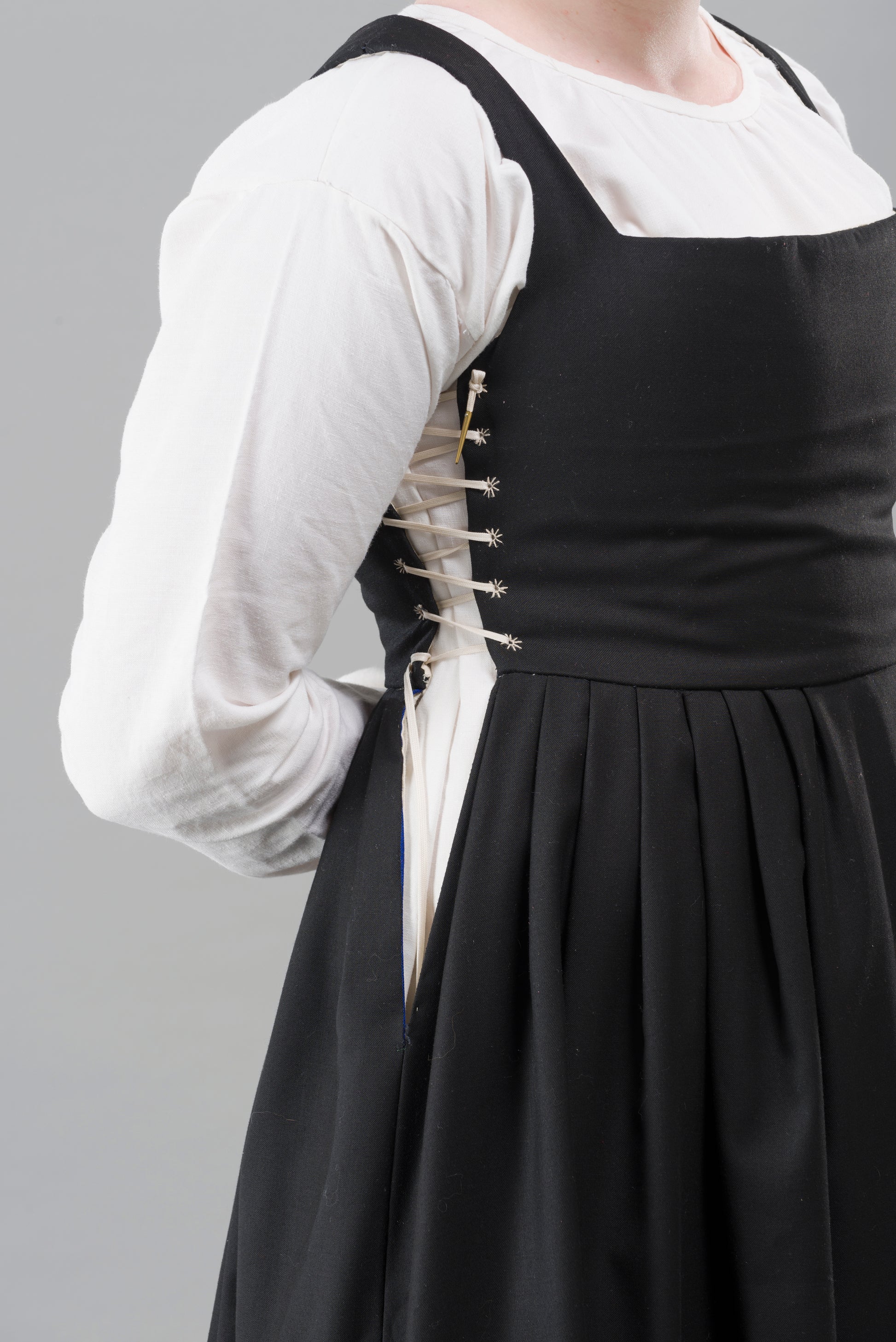 Made of 100% lightweight worsted wool lined in undyed cream linen. The kirtle is interlined in the bodies with canvas and has a square neckline at the front and a deep V at the back. The skirt is pleated to the waist at front and back. The kirtle has hand stitched eyelets for lacing closed at both sides, making for a very adjustable fit. All finishing is by hand and there is no visible machine stitching on the inside or outside.