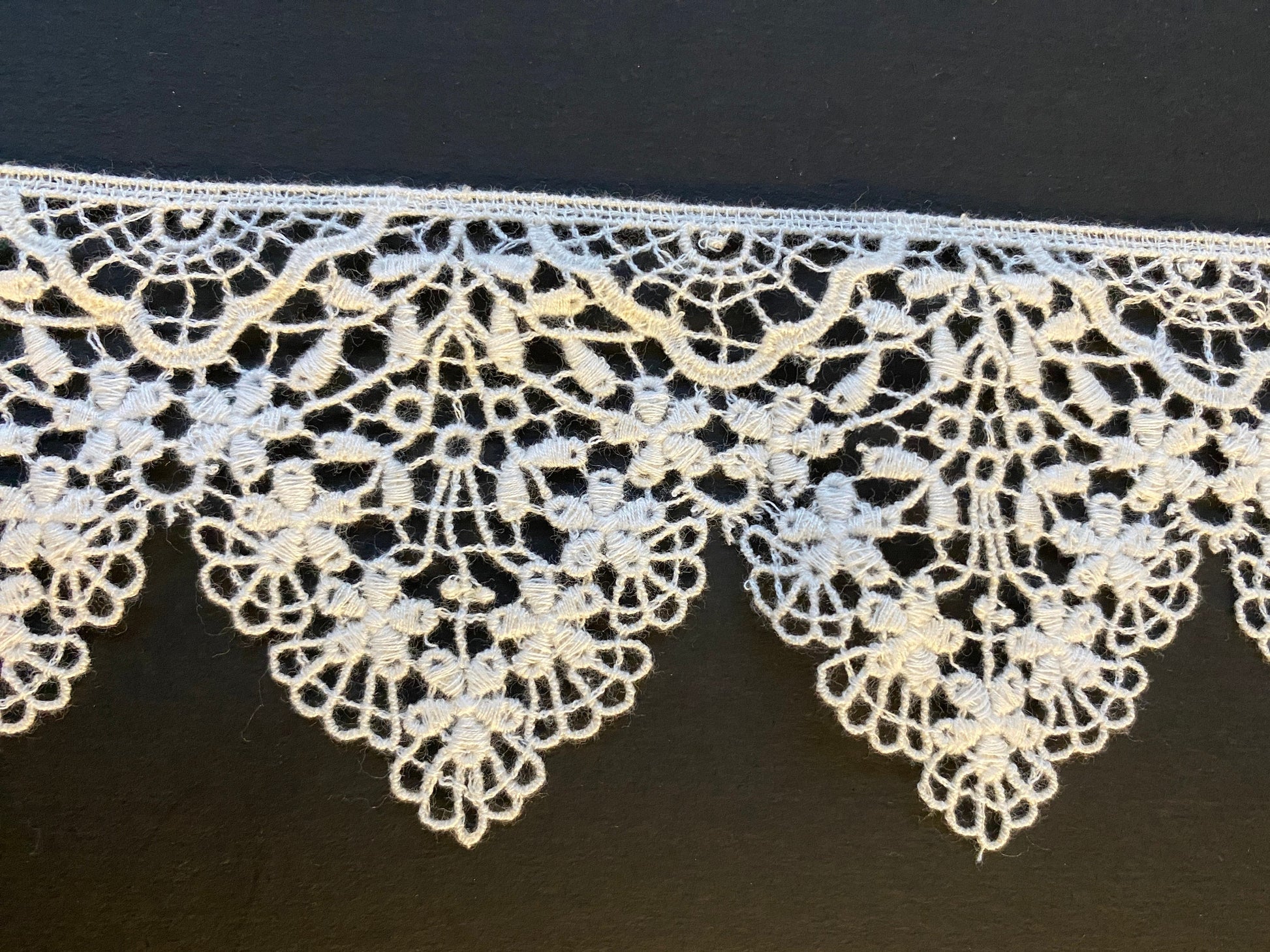 The Tudor Tailor is delighted to be able to offer a range of beautiful cotton lace from a traditional Nottingham lace factory. This design is appropriate to the 18th and 19th centuries - perfect for Georgian and Victorian costumes. Available in ivory/'old white', 2¾in (70mm) wide.