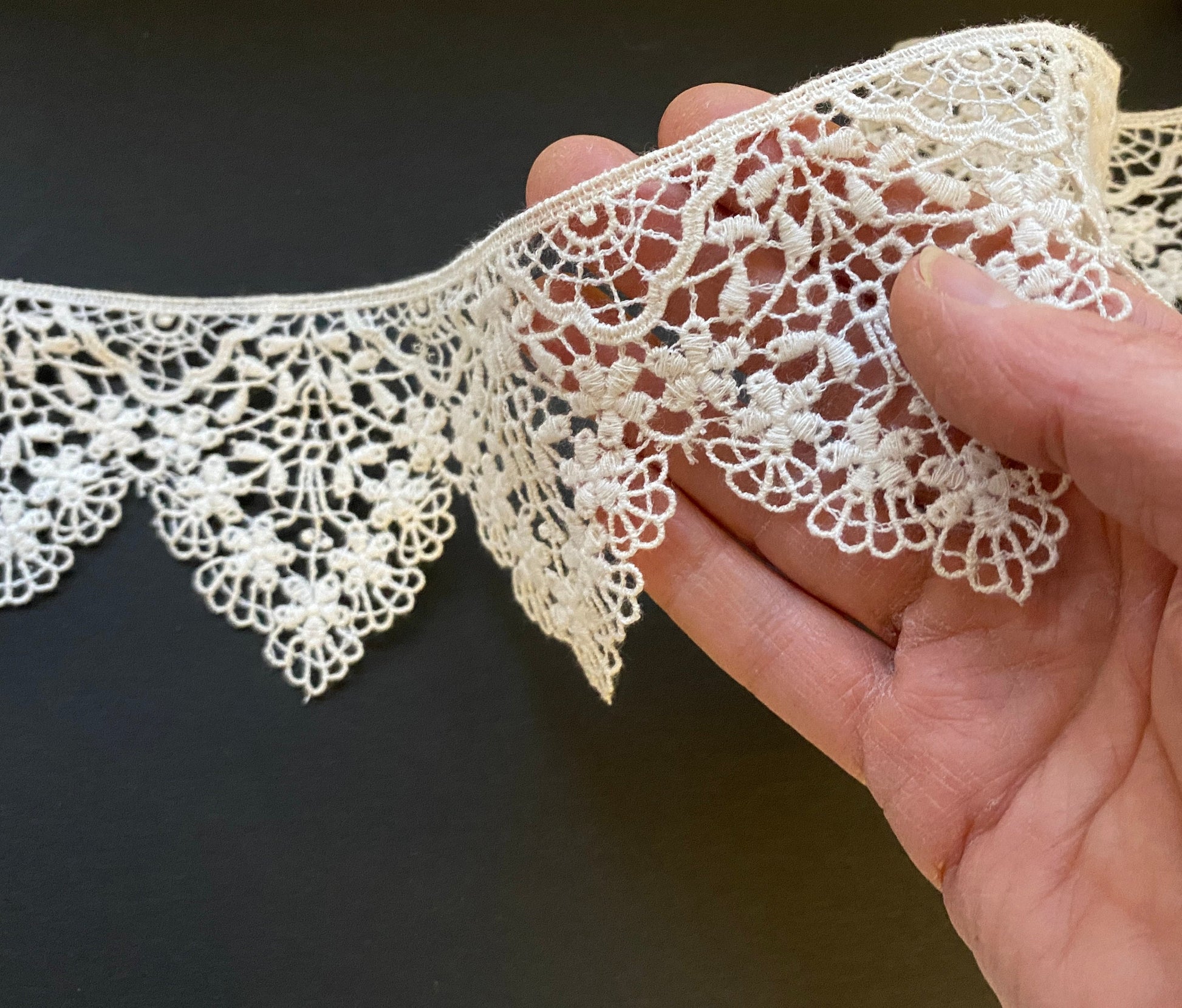 The manufacturing process of this 100% cotton lace leaves it with a creamy colour. If a brighter, whiter shade is desired it is easily achieved by soaking the lace in hand hot water mixed with ordinary washing powder. Leave the lace to soak for half an hour before checking to see if it has lightened enough. If not, leave it to soak for longer.