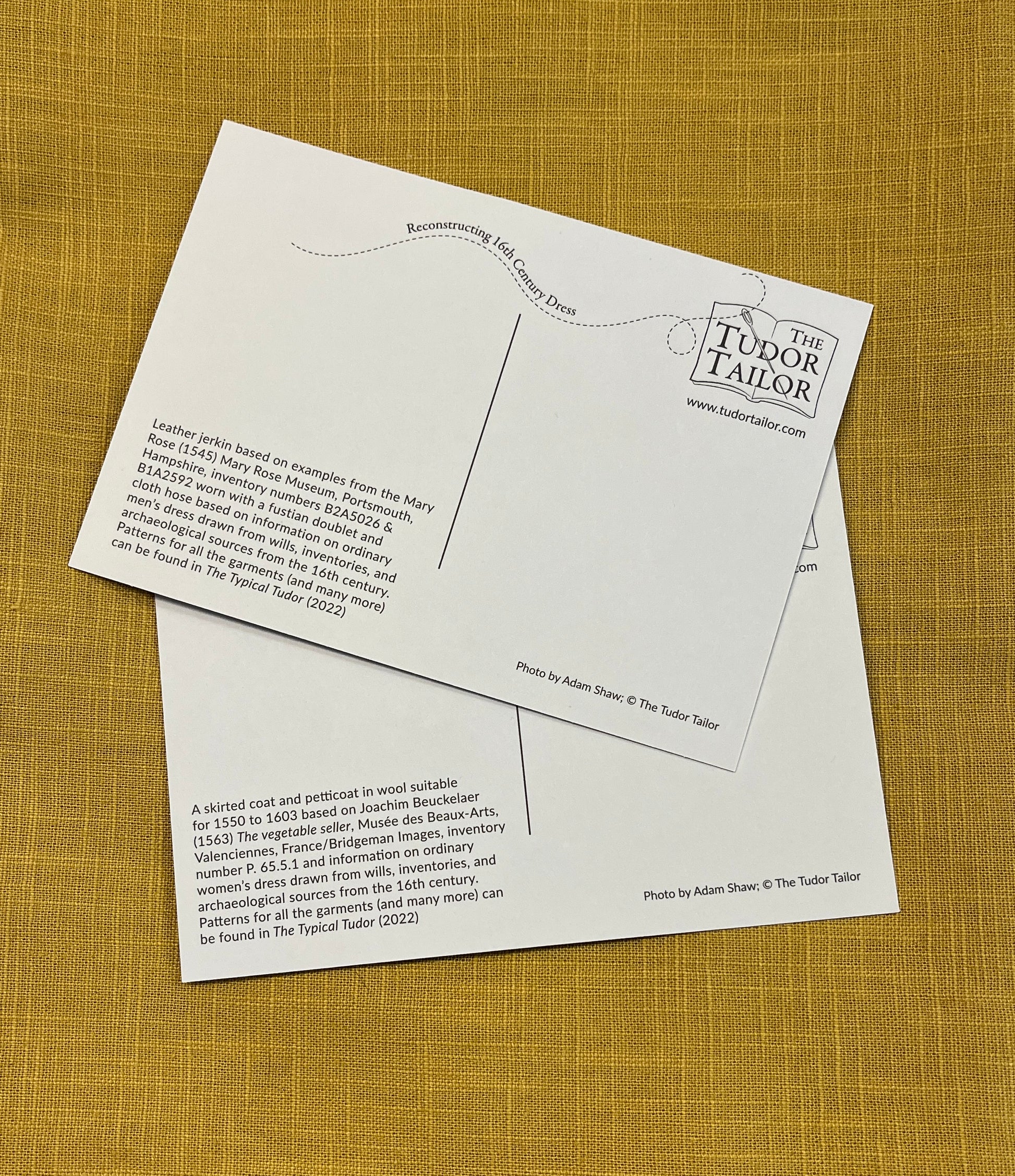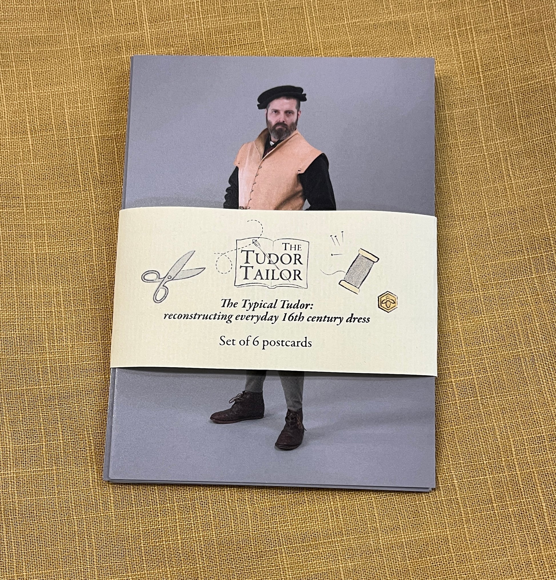A set of six postcards each featuring a 'Typical Tudor' from our book The Typical Tudor, published in 2022. The book was highly researched and based on extant examples, artwork, and documentary descriptions, including a survey of 57,687 items of dress. Each garment featured on these postcards is based on this evidence and reflects typical clothing for the mean and middling sort from 1485 to 1603.