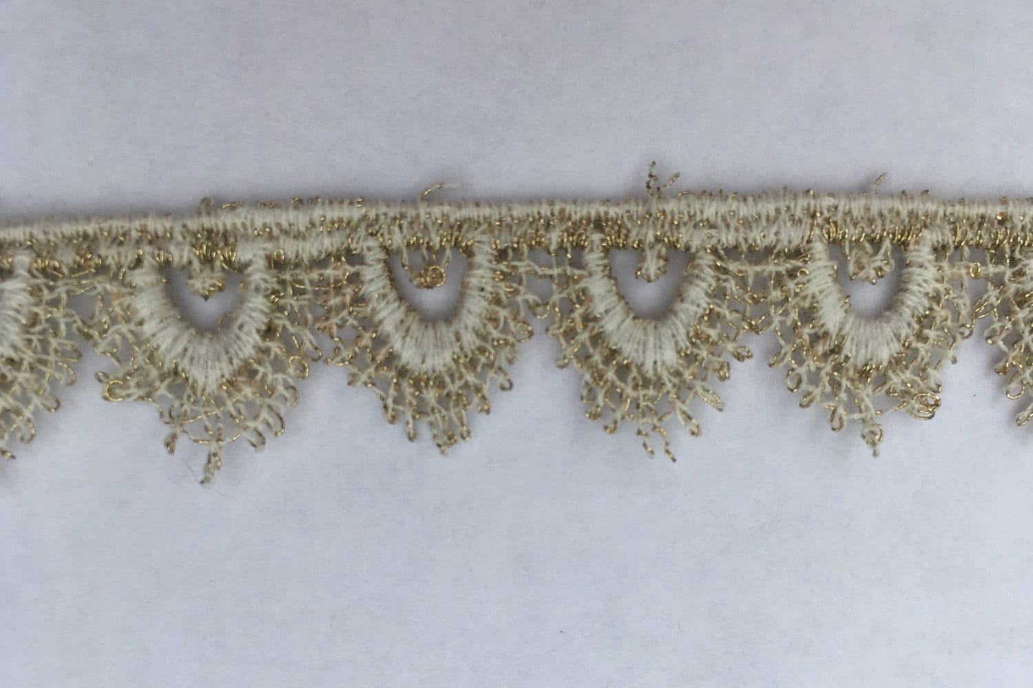 This gold version of one of our most popular styles is a new addition to our range of beautiful lace trims from a traditional Nottingham lace factory. These designs are appropriate to the 16th and early 17th centuries - perfect for Tudor and Elizabethan costumes.